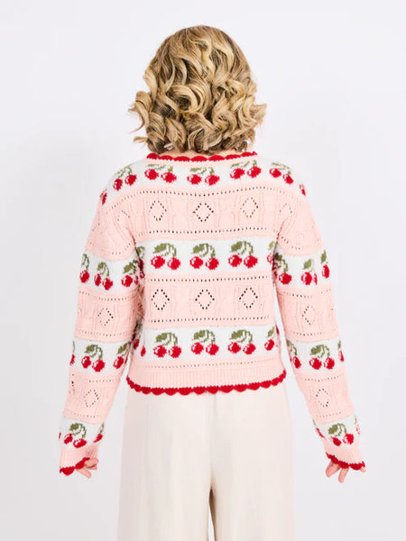 Sweet and slightly cheeky, this cherry sweater is pure joy in knit form. Featuring a soft pointelle pattern, playful cherry jacquard bands, and scalloped edges, it’s the kind of piece that instantly makes an outfit feel more fun.