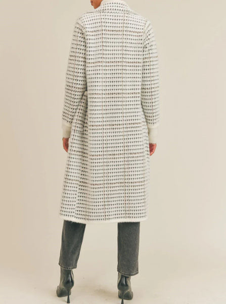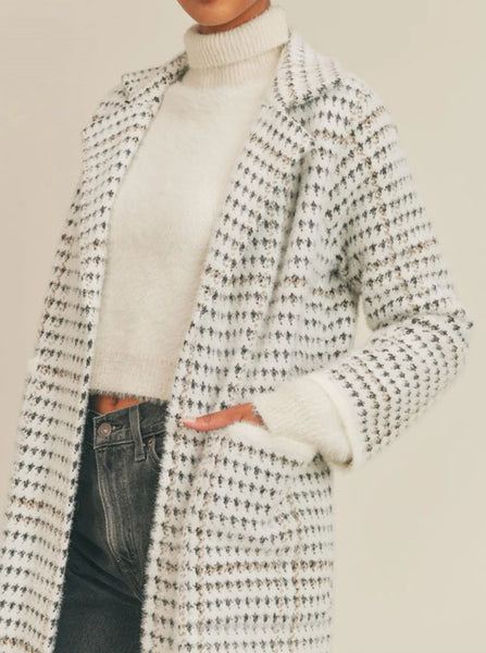 The Marceau Houndstooth Coat is a plaid knit coat with front open pockets. Comes in a lovely ivory brown color.